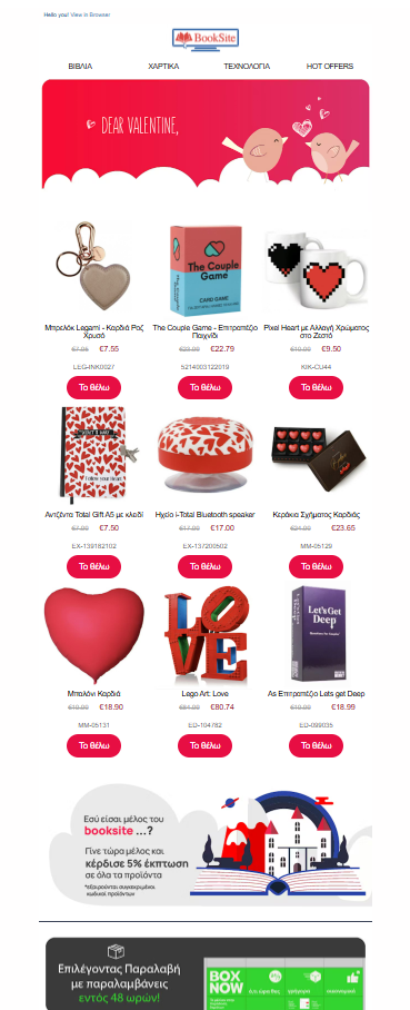 With over 40 years of presence in the Greek market and an online store operating since 2017, BookSite has built its reputation around variety, accessibility, and customer service. That retail mindset resulted in the following Valentine’s Day email campaign.