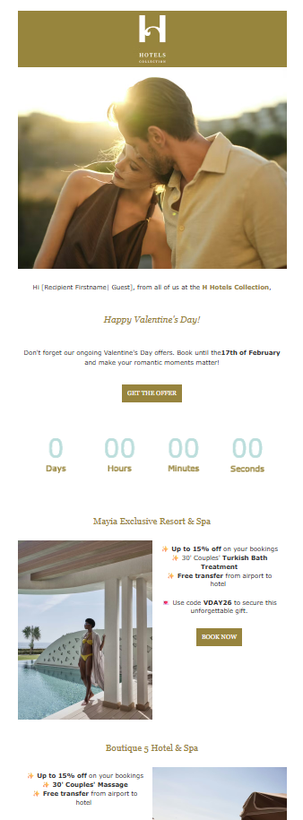 Resort-specific benefits, such as couples’ spa treatments, complimentary airport transfers, and discount codes, are clearly listed below. The emotional imagery sets the mood, but the practical details drive the action. For a luxury hospitality brand built on long-standing Greek tradition and premium experiences, this balance matters.