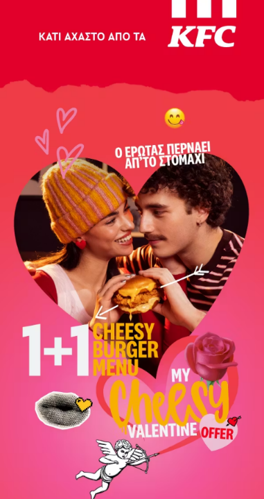 The 1+1 Cheesy Burger Menu was also clearly positioned as the focal point, making the offer easy to understand at a glance. At the same time, doodles, cupid illustrations, and bold typography added humor and energy without distracting from the conversion goal.