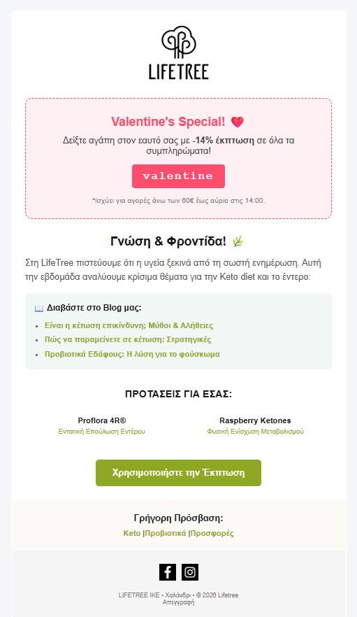 The campaign opens with a direct message: “Show love to yourself with -14% on all supplements.” The discount code is clearly presented, along with purchase conditions and expiration timing. Nothing feels hidden or overly promotional.