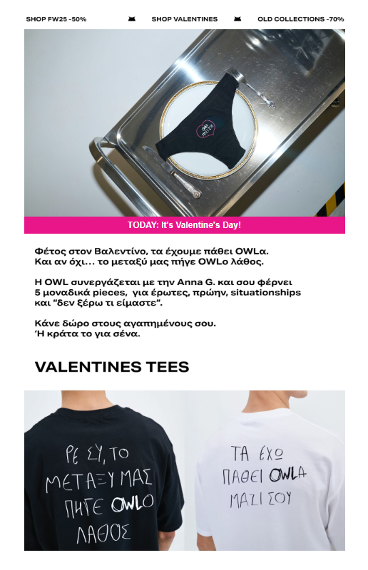 OWLClothes, a Thessaloniki-based streetwear brand rooted in urban culture, treats apparel as expression rather than just a product. That mindset is reflected in its Valentine’s email.